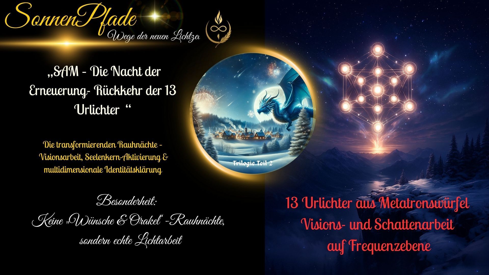 Hörbuch Wintertrilogie: Die Drachen-Sage die durch die Zeit führt und das begleitende Gesamtwerk für den Workshop darstellt. Du findest dort eine Sage, die in uralten schriften verborgen waren und die uns auf verschiedenen Astralreisen und Channelings offenbart wurden. Wir haben sie in die irdische Welt getragen und SAM und seine Begleiter nehmen dich mit auf eine Reise mit vielen tiefgründigen Abenteuern und eine einzigartigen Verwebung spannen wir die Brücken zu der Reise durch das Haus zwischen den Zeiten. Doch diese Reise bedarf keiner Beziehung zu SAM, der die Drachenwelt verkörpert oder einer anderen Verbindung, sie bedarf lediglich den Wunsch nach innerer Transformation und äußerem Wandel. Wir haben alte Traditionen, mit Magie und Mystik verwoben, sodass sie mehr als nur in unsere aktuelle moderne Zeit passen und so stimmig, klar und alttagstauglich sind, das wir der festen Überzeugung sind...... Jede Seele die mit dem Herzen dabei ist wird sich in dieser Zeit wiederfinden und sich erinnern.