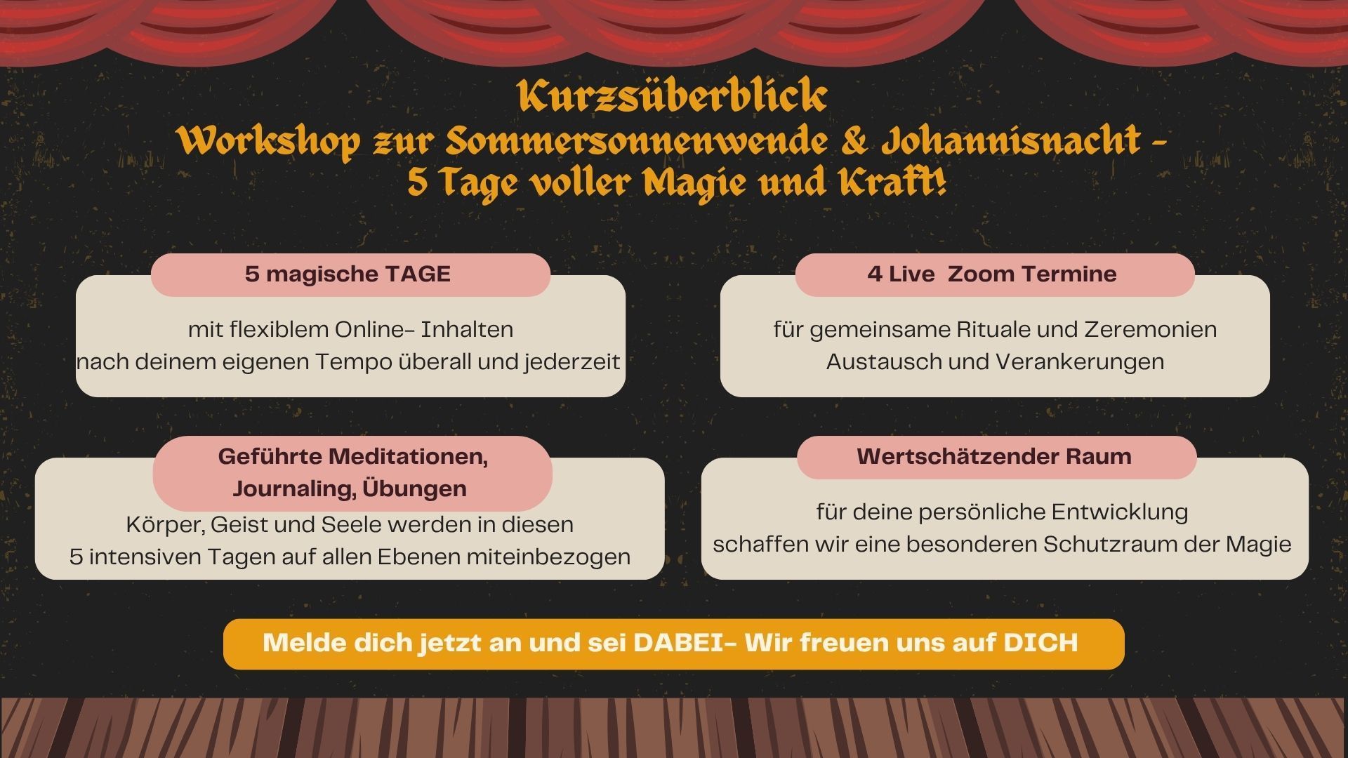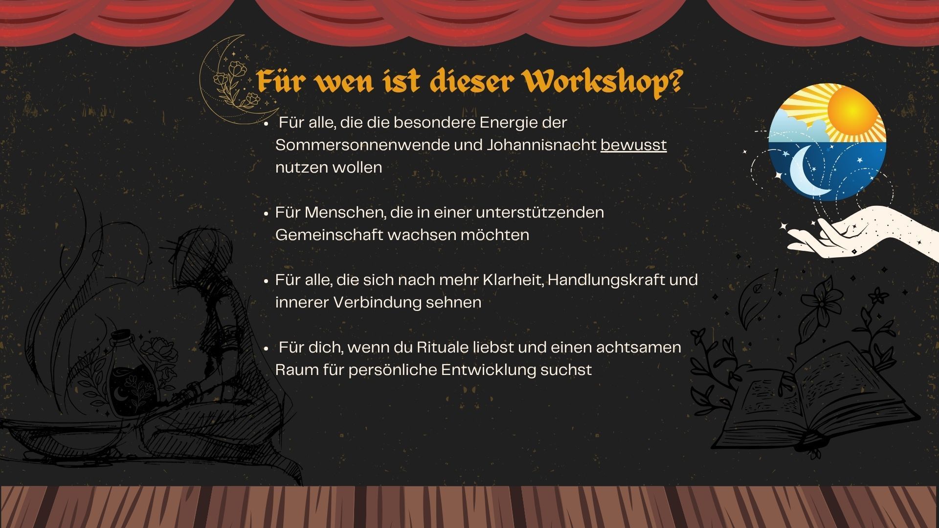 Magische Tage vom 20. Juni bis 24. Juni Lasst uns gemeinsam einen Raum öffnen, um diese energiereiche Zeit mit Ritualen, Mystik, Schamanischen Traditionen, Überliefertem zu füllen. Durch die wundervolle Himmelskonstellationen kannst du deine Heilkräfte aktivieren und deine innersten Wünsche manifestieren. Der abnehmende Mond der ins seiner Umlaufbahn immer höher aufsteigt, unterstützt beim gehenlassen von all dem was nicht mehr dienlich ist, was blockiert und behindert