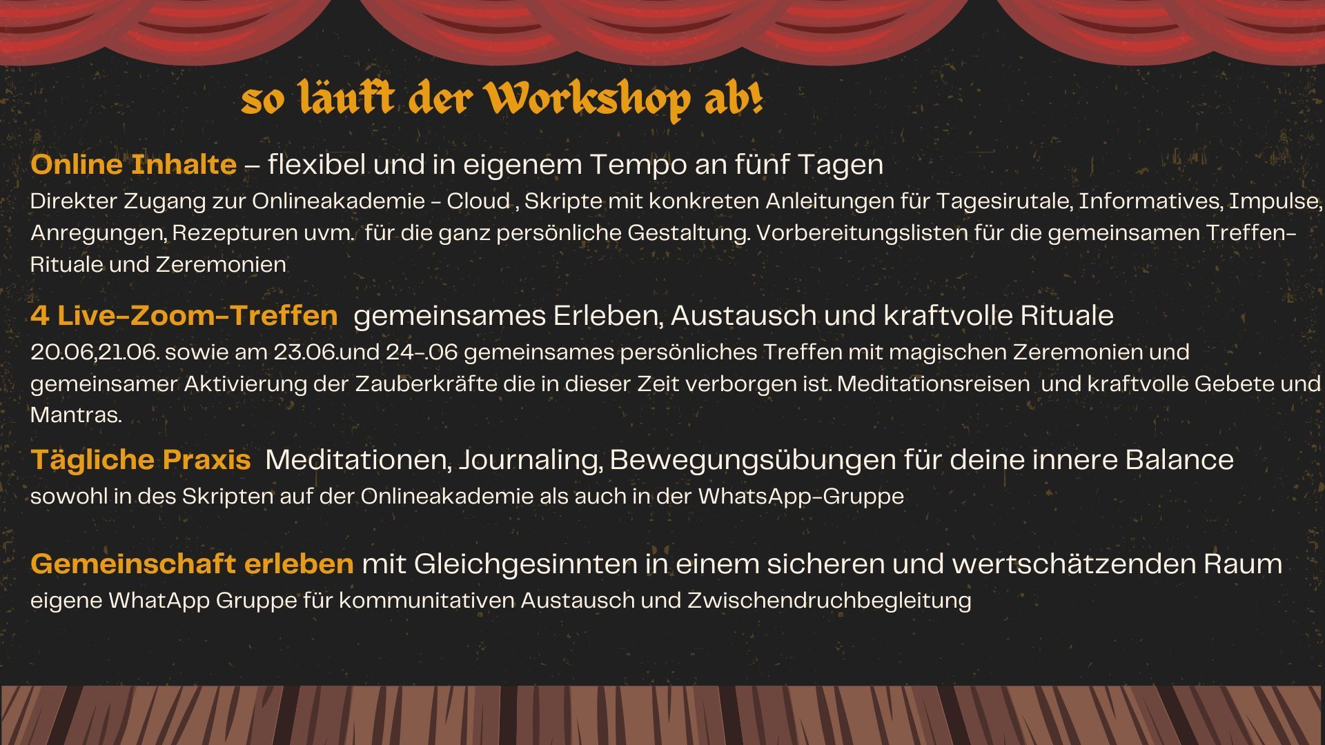 Der Workshop wird von einer geschlossenen WhatsApp Gruppe begleitet klicke auf den Button und du wirst direkt in den Warteraum weitergeleitet- nach Eingang des Energieausgleiches öffnen sich die Türen zum Hauptraum und Du betritts den Raum für eine magische Zeit.
