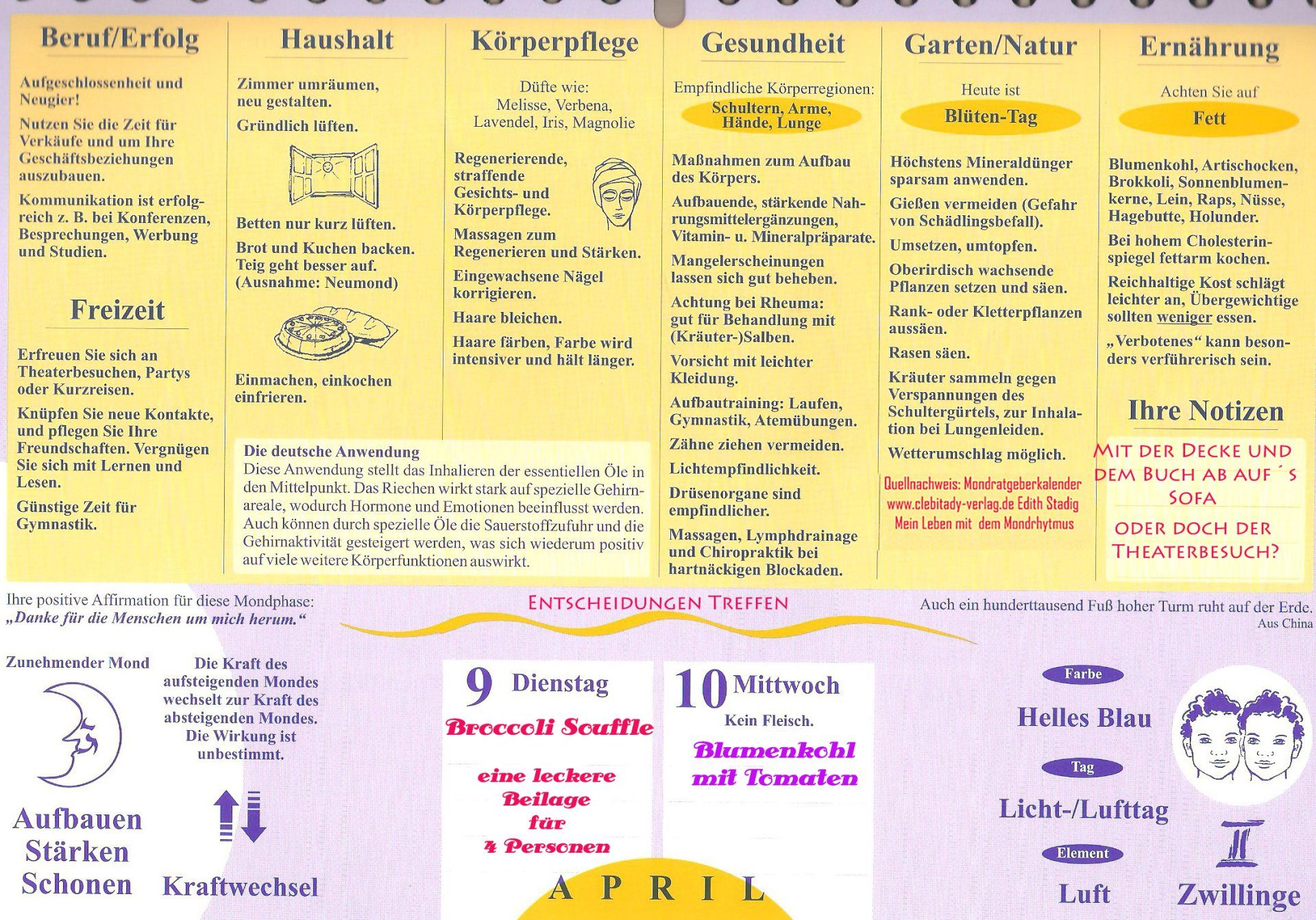 Mondmagie Dienstag, 9. April. Mond in den Zwillingen, zunehmend.