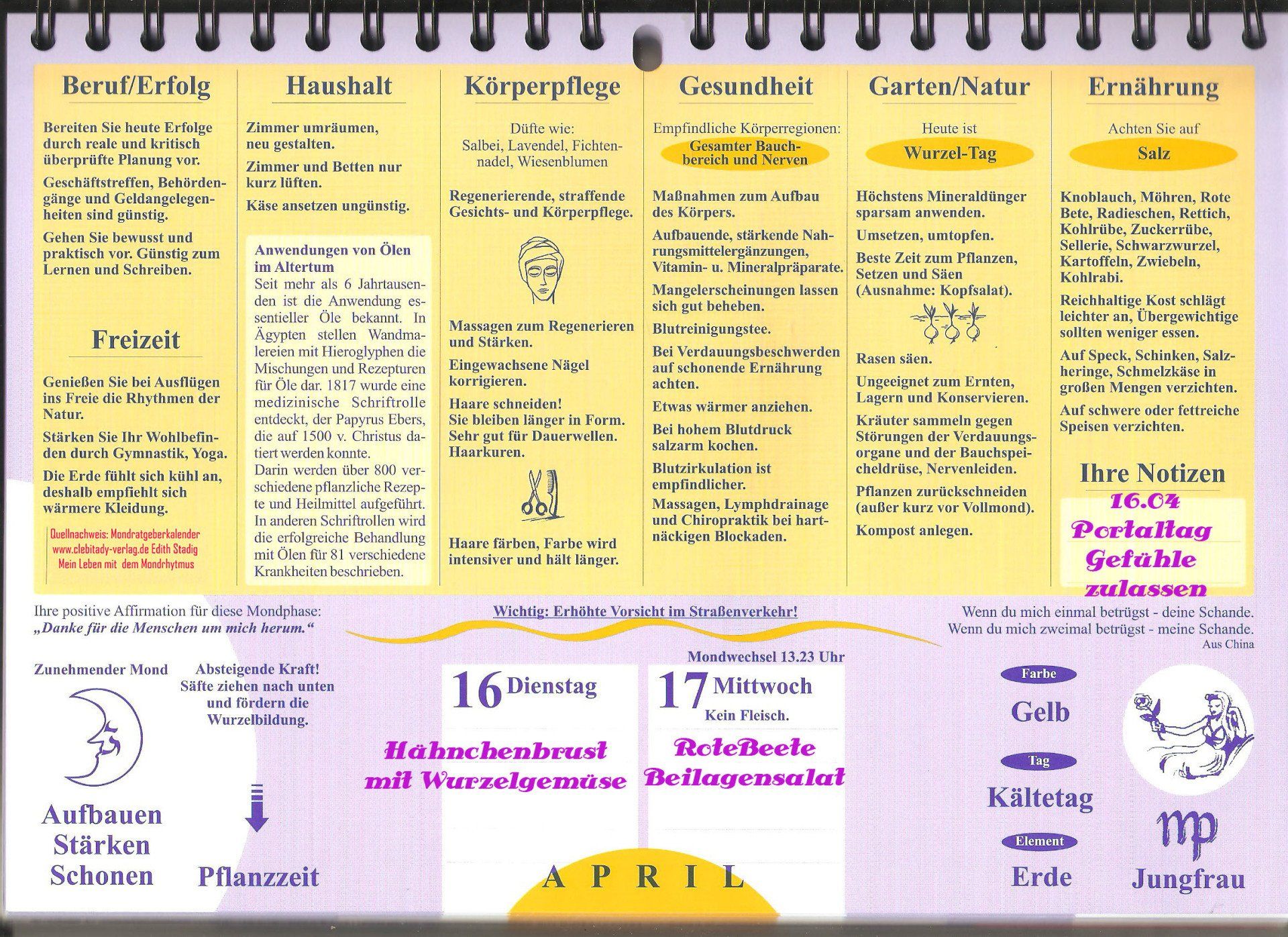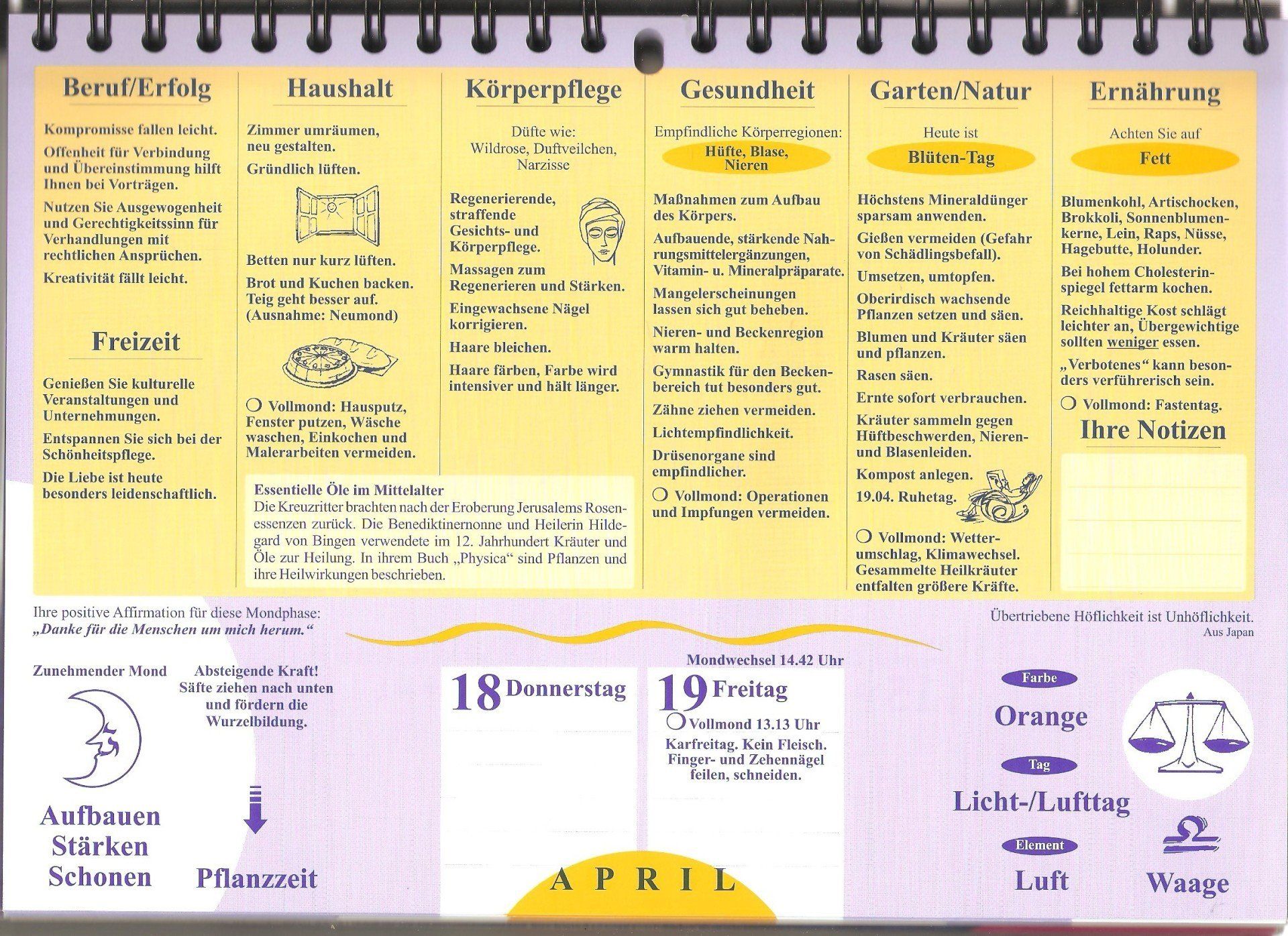 Freitag, 19. April. Karfreitag. Mond in der Waage, zunehmend. Um 13.13 Uhr ist Vollmond. Um 14.32 Uhr passiert der Mond den Skorpion, ist wieder abnehmend.