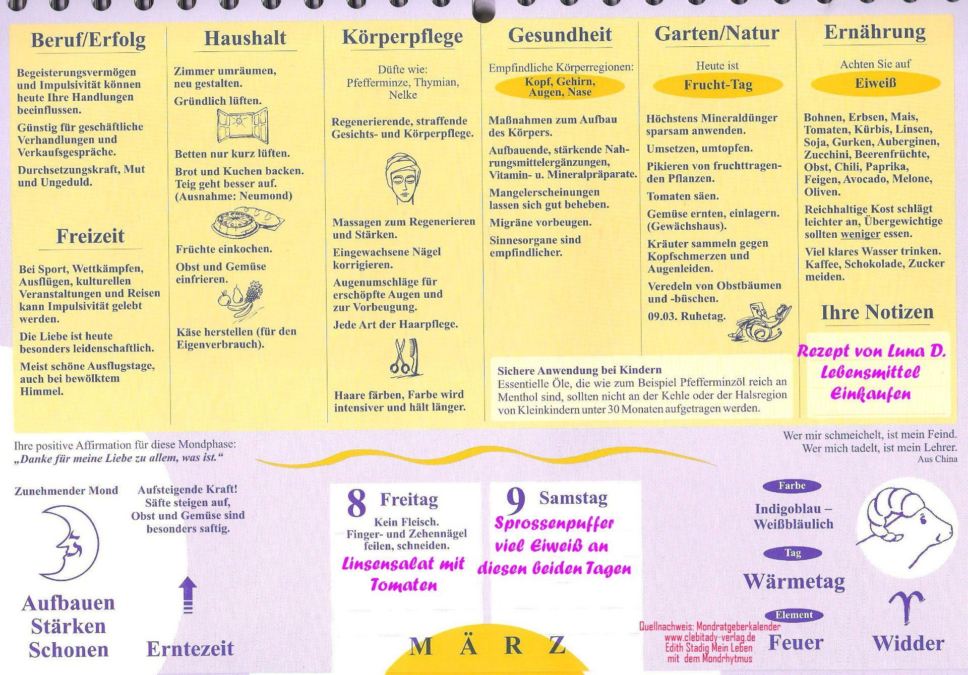 Ritualer und StärkungsRituale (Gesundheit) ist diese Zeit ideal, denn mit dem wachsenden Mond verstärkt sich auch diese Energie in den kommenden Tagen bis zum Vollmond kontinuierlich. Besonders am dritten Tag nach Neumond ist die Energie am stärksten für diese Rituale