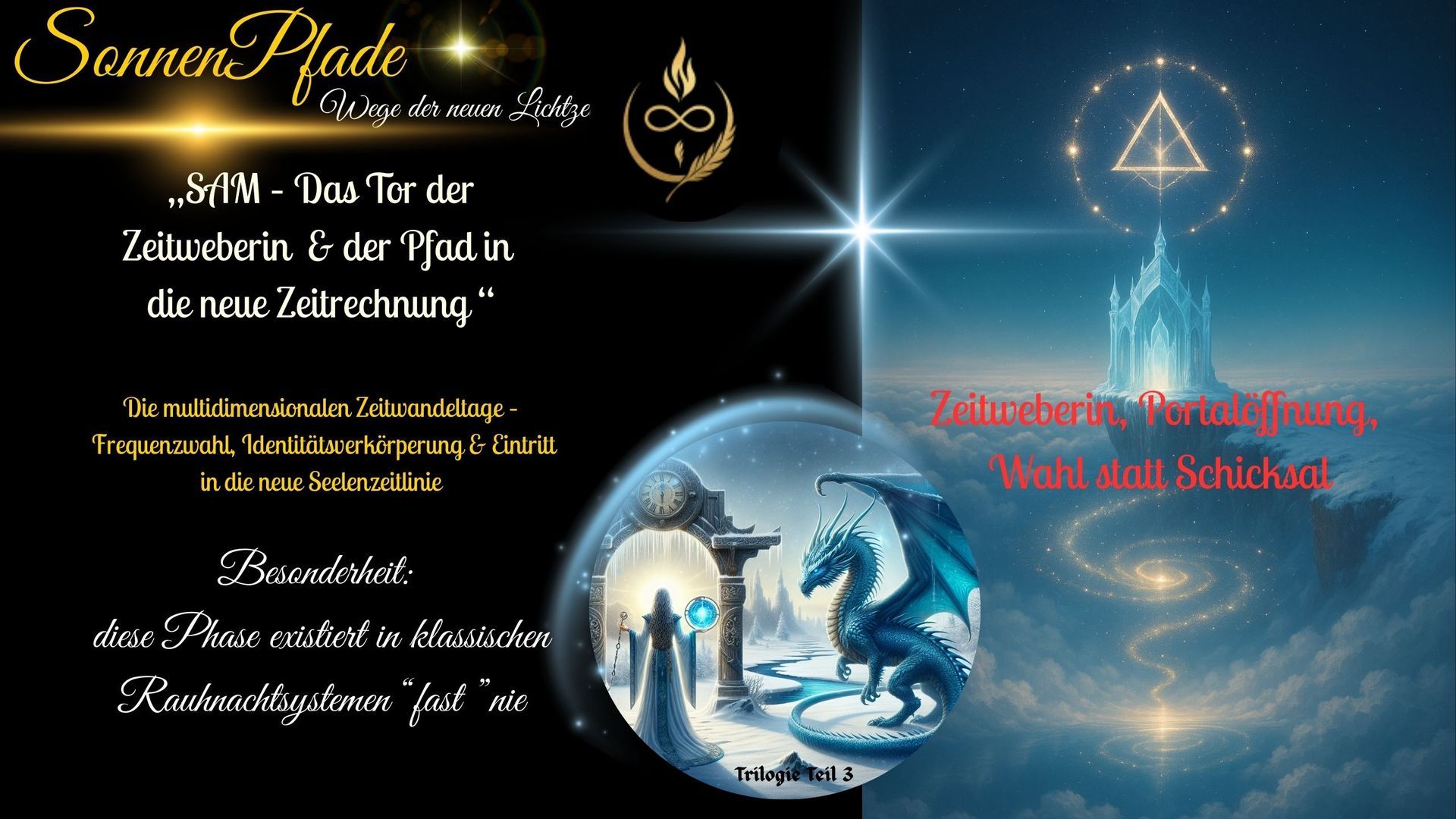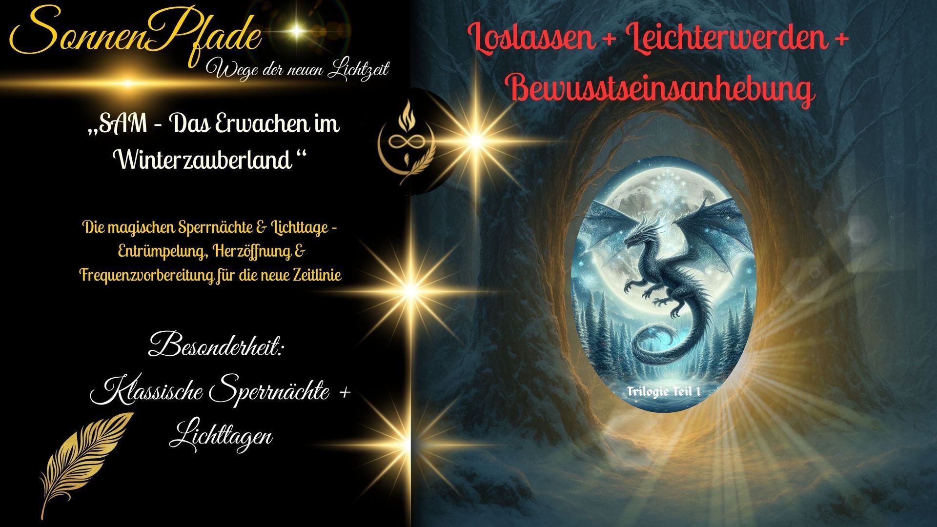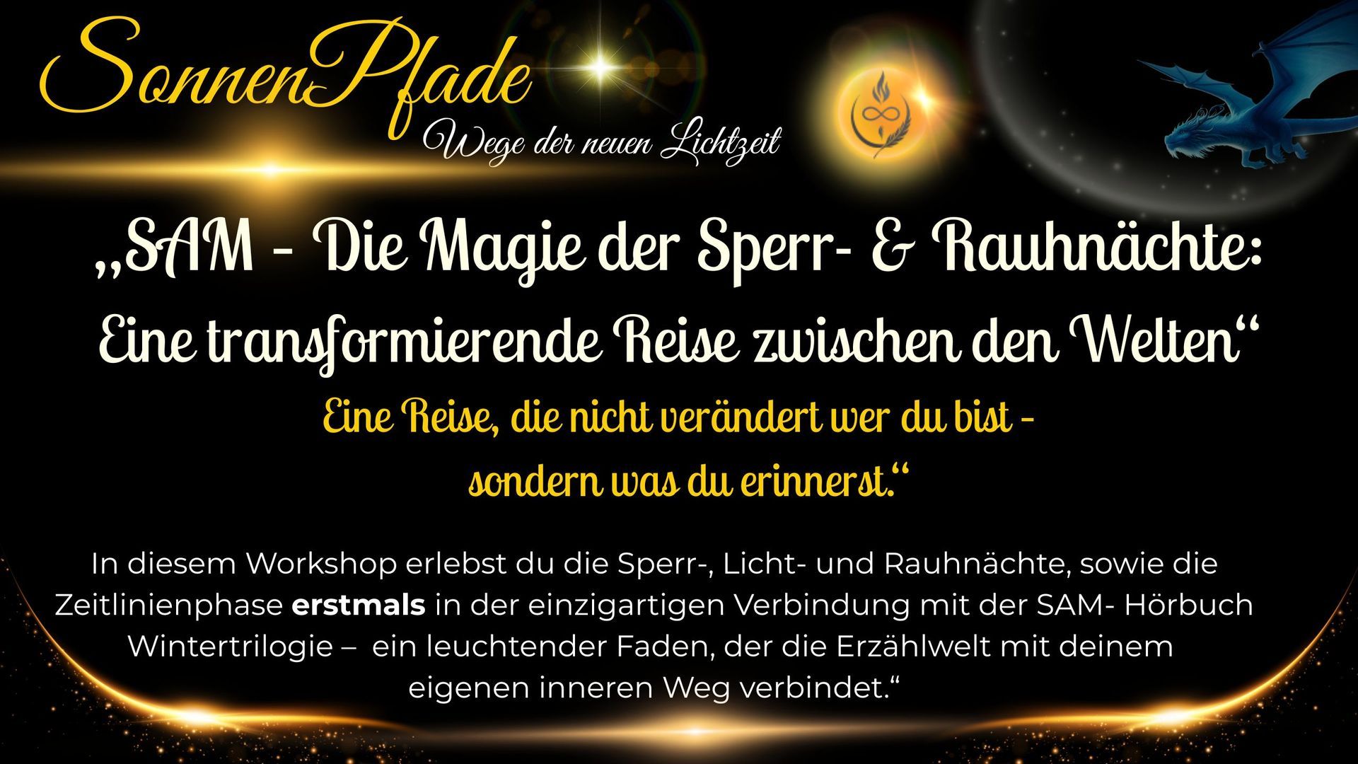 Hörbuch Wintertrilogie: Die Drachen-Sage die durch die Zeit führt und das begleitende Gesamtwerk für den Workshop darstellt. Du findest dort eine Sage, die in uralten schriften verborgen waren und die uns auf verschiedenen Astralreisen und Channelings offenbart wurden. Wir haben sie in die irdische Welt getragen und SAM und seine Begleiter nehmen dich mit auf eine Reise mit vielen tiefgründigen Abenteuern und eine einzigartigen Verwebung spannen wir die Brücken zu der Reise durch das Haus zwischen den Zeiten. Doch diese Reise bedarf keiner Beziehung zu SAM, der die Drachenwelt verkörpert oder einer anderen Verbindung, sie bedarf lediglich den Wunsch nach innerer Transformation und äußerem Wandel. Wir haben alte Traditionen, mit Magie und Mystik verwoben, sodass sie mehr als nur in unsere aktuelle moderne Zeit passen und so stimmig, klar und alttagstauglich sind, das wir der festen Überzeugung sind...... Jede Seele die mit dem Herzen dabei ist wird sich in dieser Zeit wiederfinden und sich erinnern.